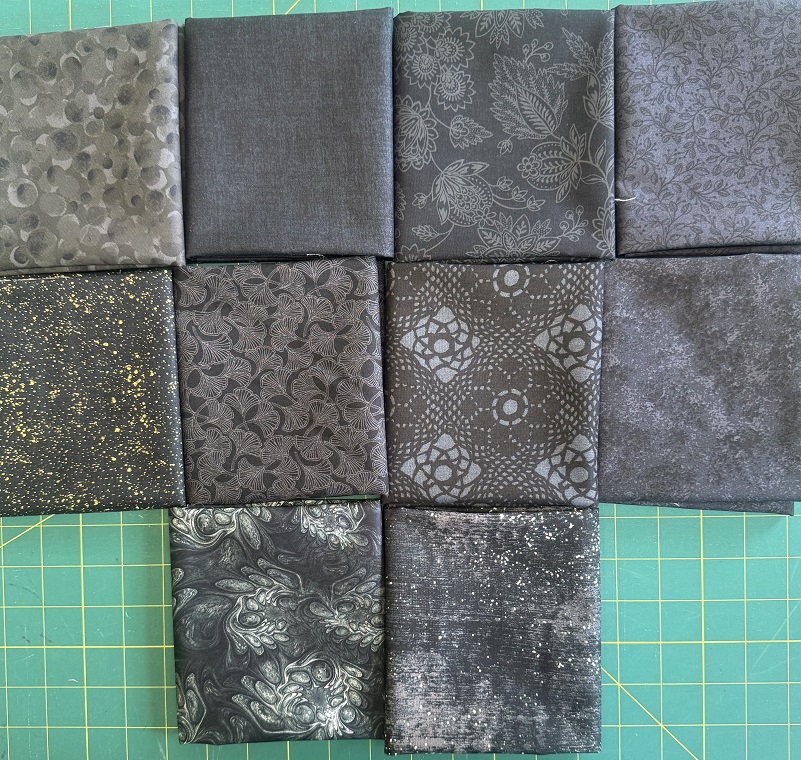 10 Fat Quarters (approx 20″ x 21″) of black on black mixer fabrics.