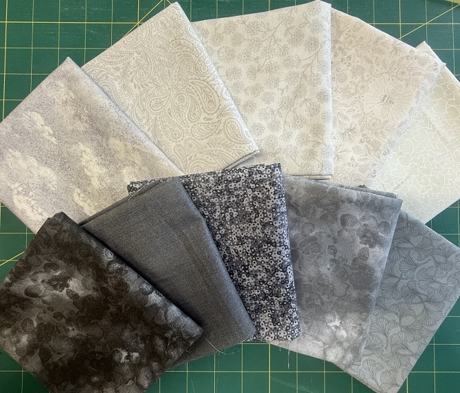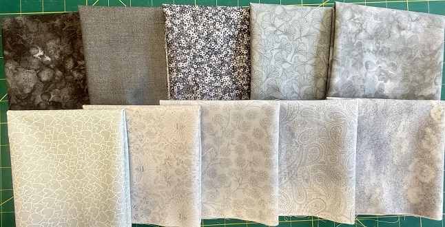 10 Fat Quarters (approx 20″ x 21″) of grey mixer fabrics.